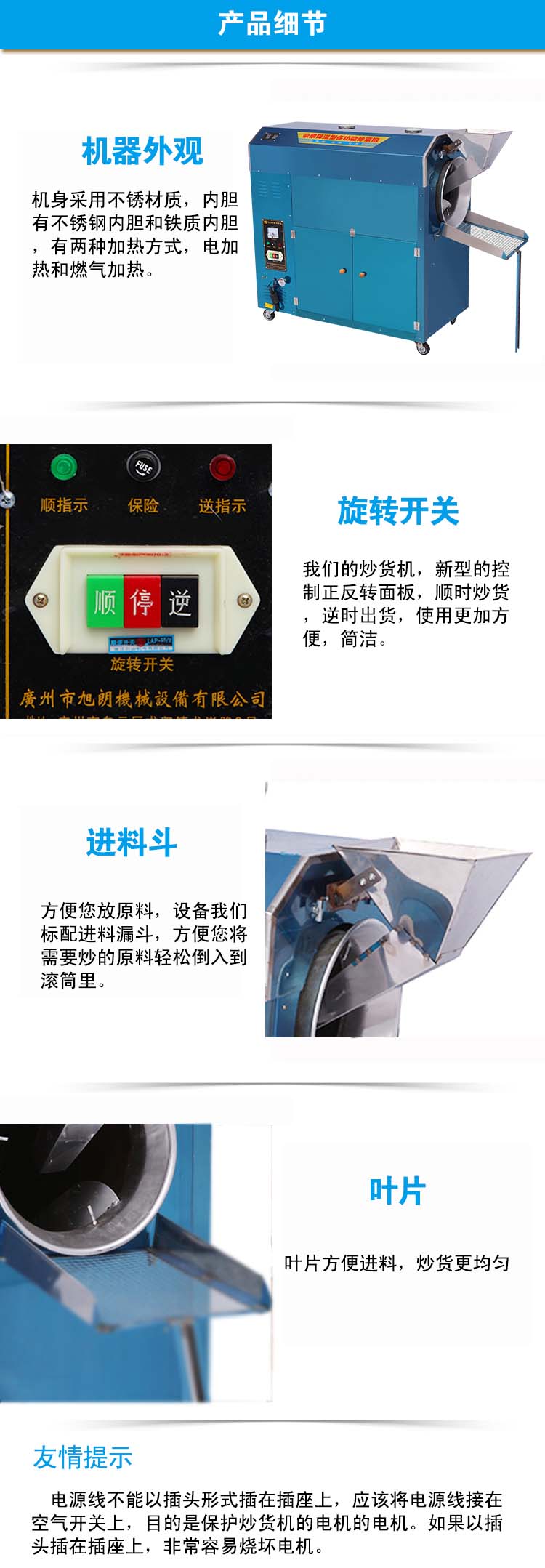 1.旭朗炒貨機(jī)有30型.60型.120型三種,每個(gè)型號(hào)各有燃?xì)饧訜岷碗娂訜醿煞N方式。