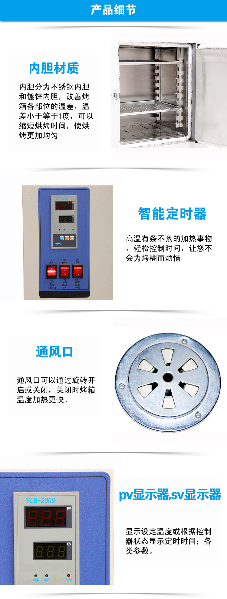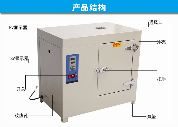 本品工作室下部裝有發(fā)熱絲,左側(cè)裝有鼓風(fēng)裝置,溫度控制儀控制溫度恒定及高低,工作時(shí)空氣由箱底進(jìn)氣