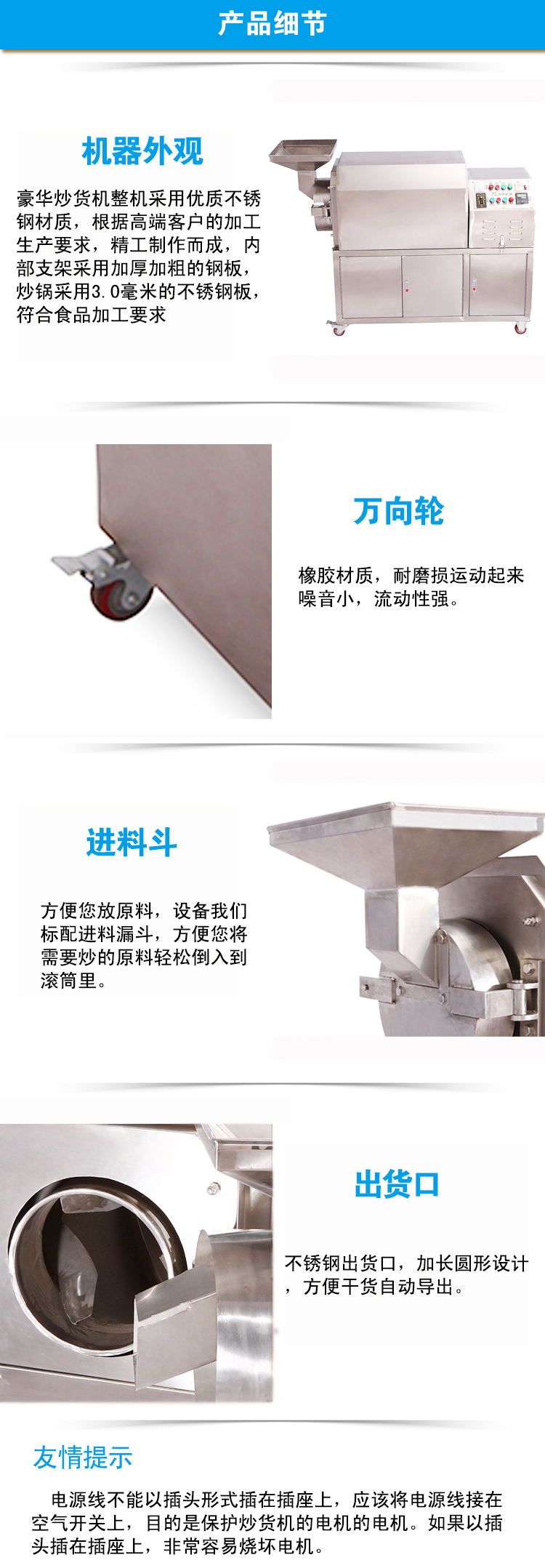1、旭朗推出的豪華炒貨機(jī)采用不銹鋼材質(zhì),獨(dú)特的滾筒臥式結(jié)構(gòu),加熱均勻,密封性好,燜炒效果特別好。同