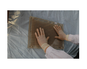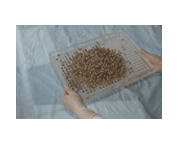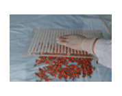在排列好的B板上倒入藥粉,用刮粉板來(lái)回刮動(dòng),使藥粉裝滿各個(gè)膠囊體。