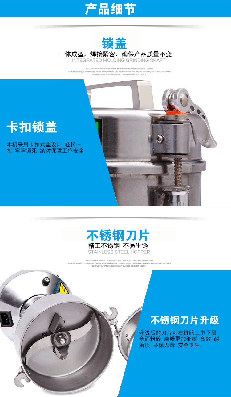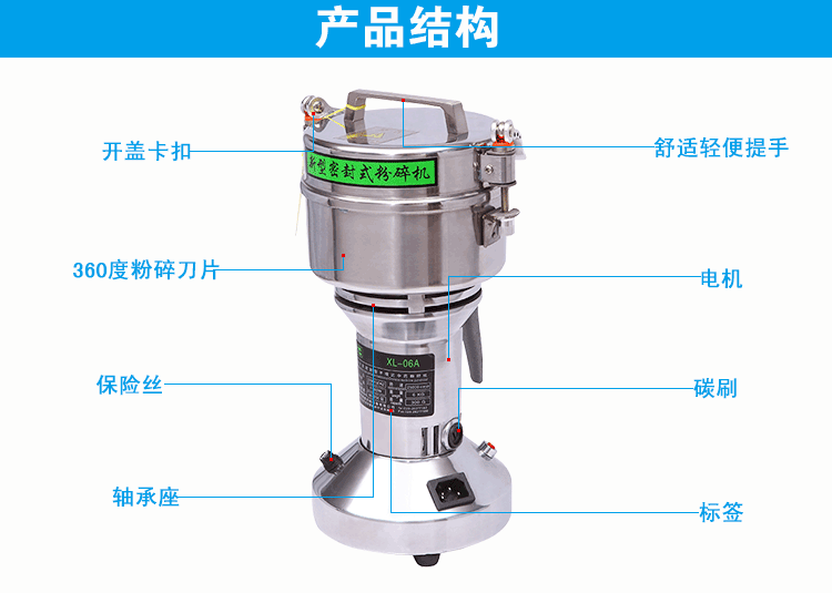 2、本機(jī)優(yōu)點(diǎn)是:粉碎室和蓋子未采用傳統(tǒng)的螺紋旋合設(shè)計(jì),采用密封圈密封免螺絲設(shè)計(jì),操作更方便。避免了過去