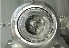 渦輪粉碎機動轉(zhuǎn)時,電機帶動主軸及渦輪高速旋轉(zhuǎn)。渦輪與篩網(wǎng)圈上的磨塊組成破碎、研磨副,當物料從加料斗中