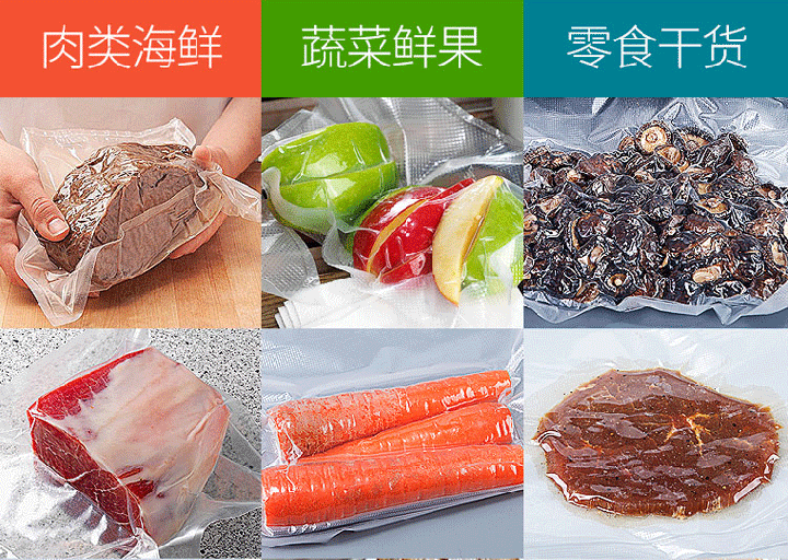 需要長(zhǎng)時(shí)間保存的干鮮果品、茶葉、種子、生熟肉類、藥品、電子器件、音像制品、照相機(jī)、毛料衣服、金銀手飾等各類食品和物品,經(jīng)真空包裝后,可以有效的起到保鮮、保質(zhì)、防霉變、防潮、防銹、防污染、防氧化及防污染,從而延長(zhǎng)保存期。